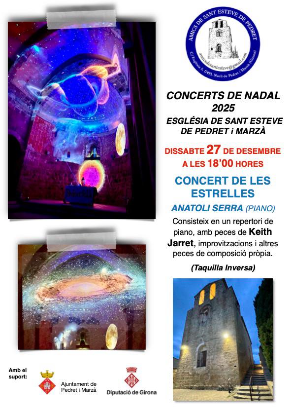 Agenda Concert de Nadal 27/12/2025 ESGLÉSIA DE SANT ESTEVE DE PEDRET i MARZÀ Dissabte 27 de desembre a les 18’00 hores Anatoli Serra (piano) Repertori de piano, amb peces de Keith Jarret, improvisacions i altres peces de composició pròpia. Taquilla Inversa < Entrada AnteriorEntrada Posterior >